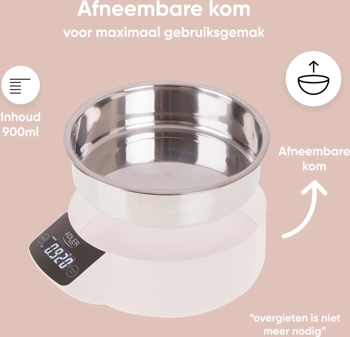 De weegschaal komt met een flinke mengkom van 0,9 liter. Naast dat deze ook een prachtige look heeft is hij hierdoor gemakkelijk te verwijderen en onder de kraan af te wassen. Dit maakt zelfs opruimen een fluitje van een cent!