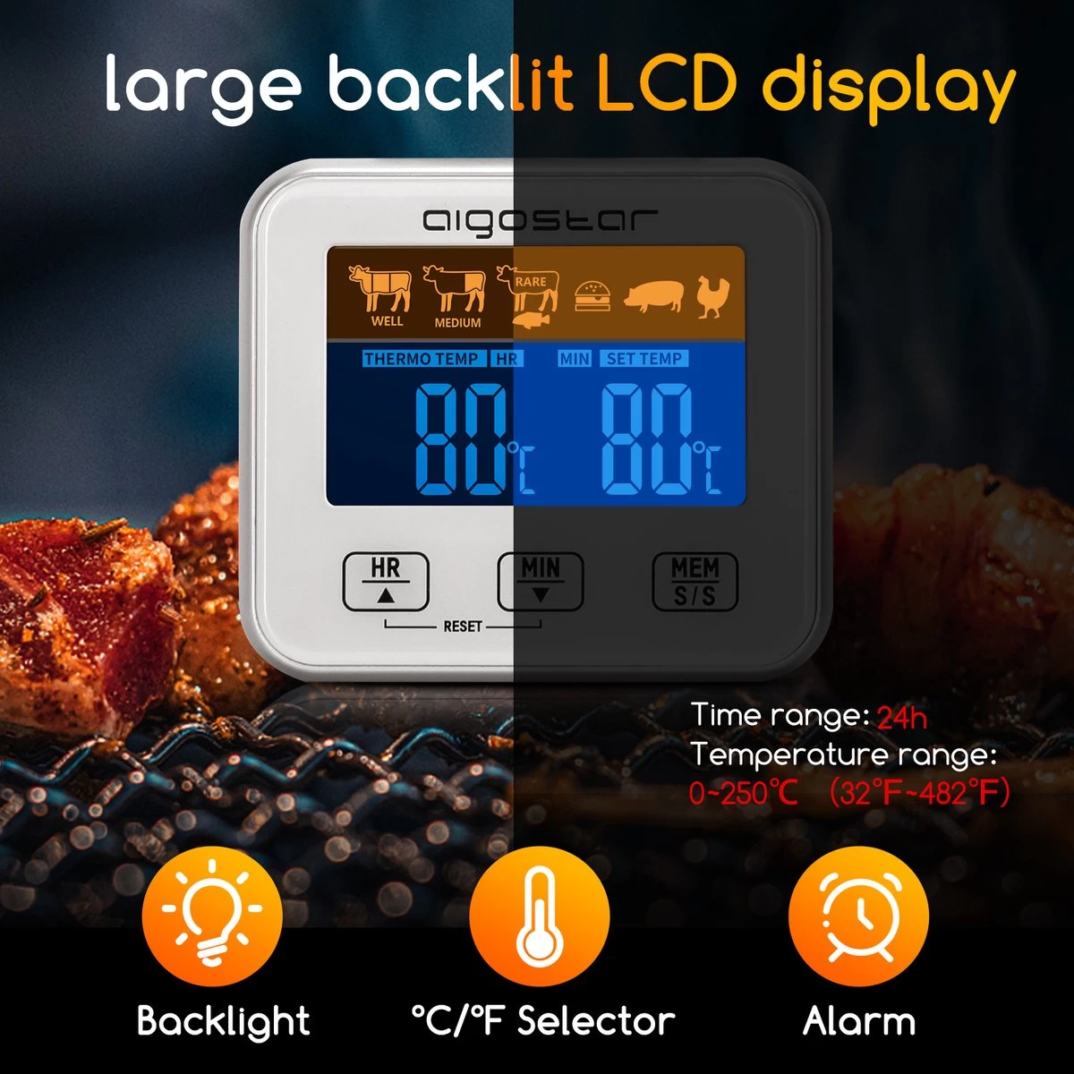 De sonde is ontworpen met een groot LCD-scherm met achtergrondverlichting, en biedt een meer intuïtieve ervaring bij het koken bij weinig licht. Raak de thermometer aan om het display te verlichten en het scherm blijft 1 minuut branden en schakelt vervolgens uit tenzij er verdere actie wordt ondernomen. Het ontwerp hiervan kan de levensduur van de batterij verlengen.