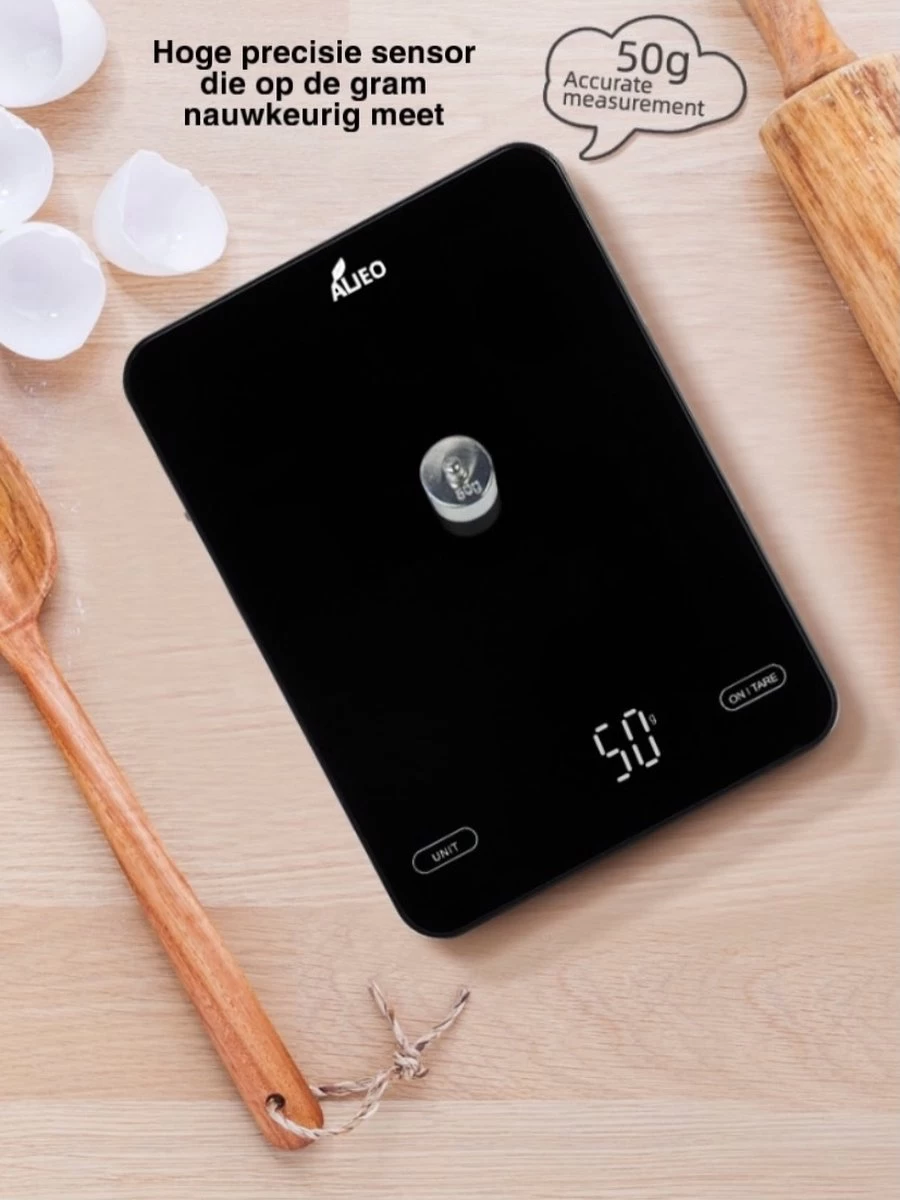 De weegschaal heeft een een ingebouwde oplaadbare lithiumbatterij. Deze ALJEO digitale precisie keukenweegschaal meet nauwkeurig en precies tot 10kg (min. 2gram- max. 10kg). De weegschaal heeft een helder display en het weegoppervlak is voorzien van sterk gehard glas, hierdoor is het makkelijk schoon te maken en is het weegoppervlak waterproof. De weegschaal is ook voorzien van een modern touchscreen. De weegschaal heeft een groter weegoppervlak dan de meeste andere keukenweegschalen, dit is ideaal als je kommen en andere grotere objecten wil wegen. De weegschaal is afstelbaar naar de gewenste meetmaat. Ook is de weegschaal voorzien van een Tarra-functie, dit bespaart een hoop rekenwerk en zorgt voor veel gemak.