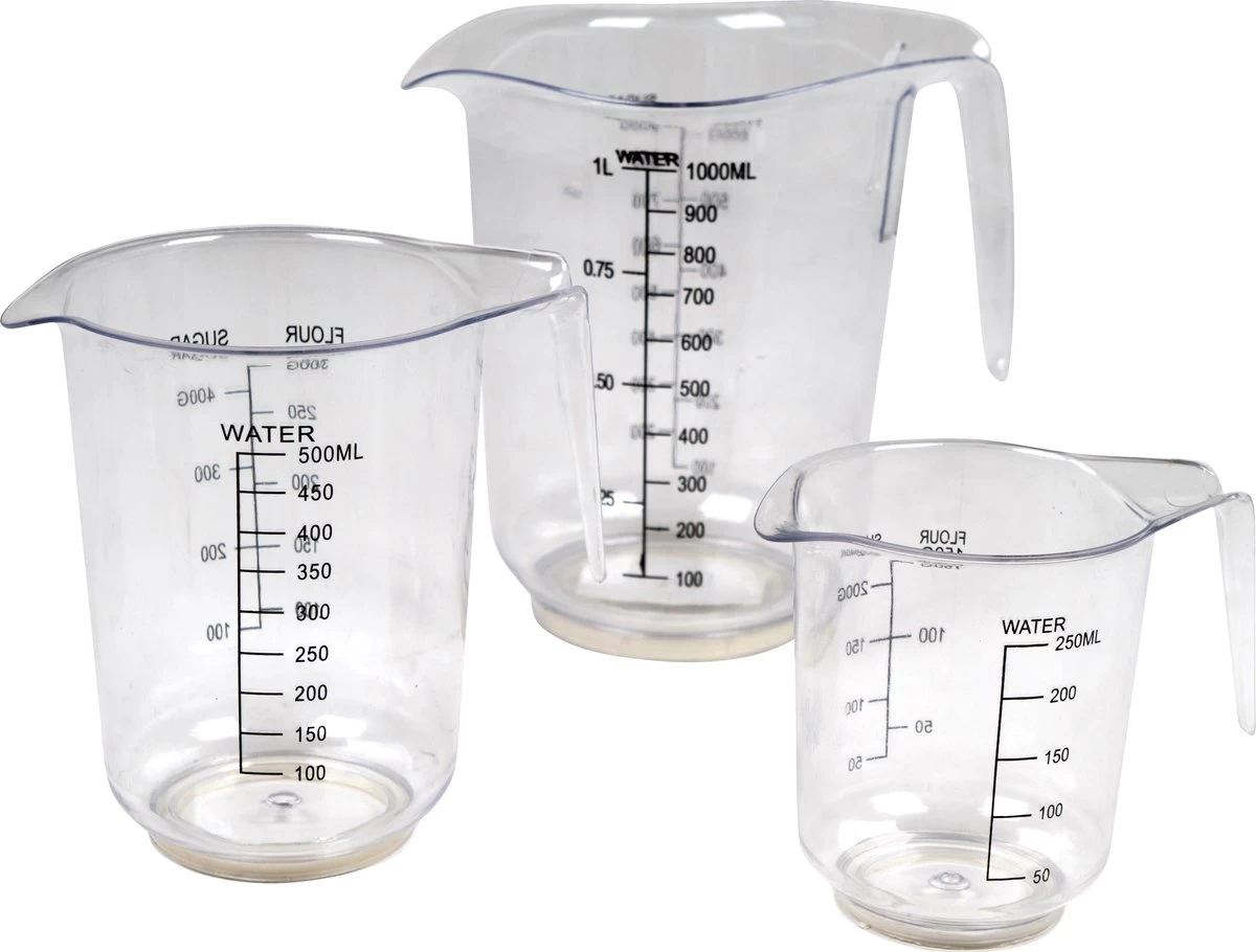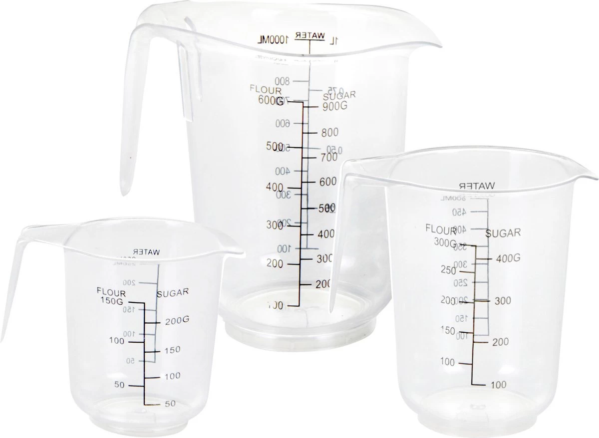 Set van 3x stuks transparante maatbekers met handvat. Deze set bevat maatbekers in de volgende formaten: – 250 ml/0,25 liter – 500 ml/0,5 liter – 1000 ml/1 liter. Materiaal: kunststof (polystyreen).