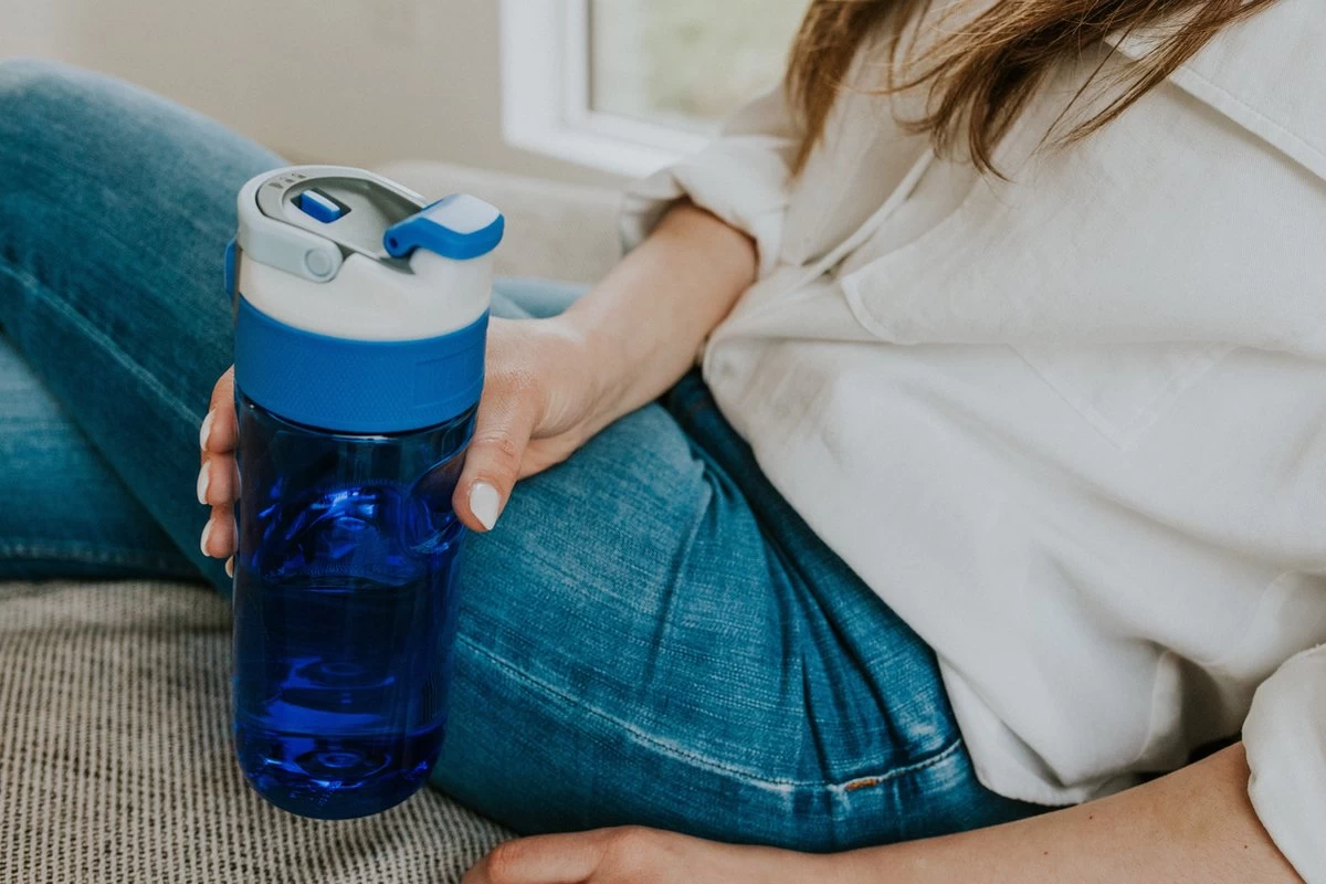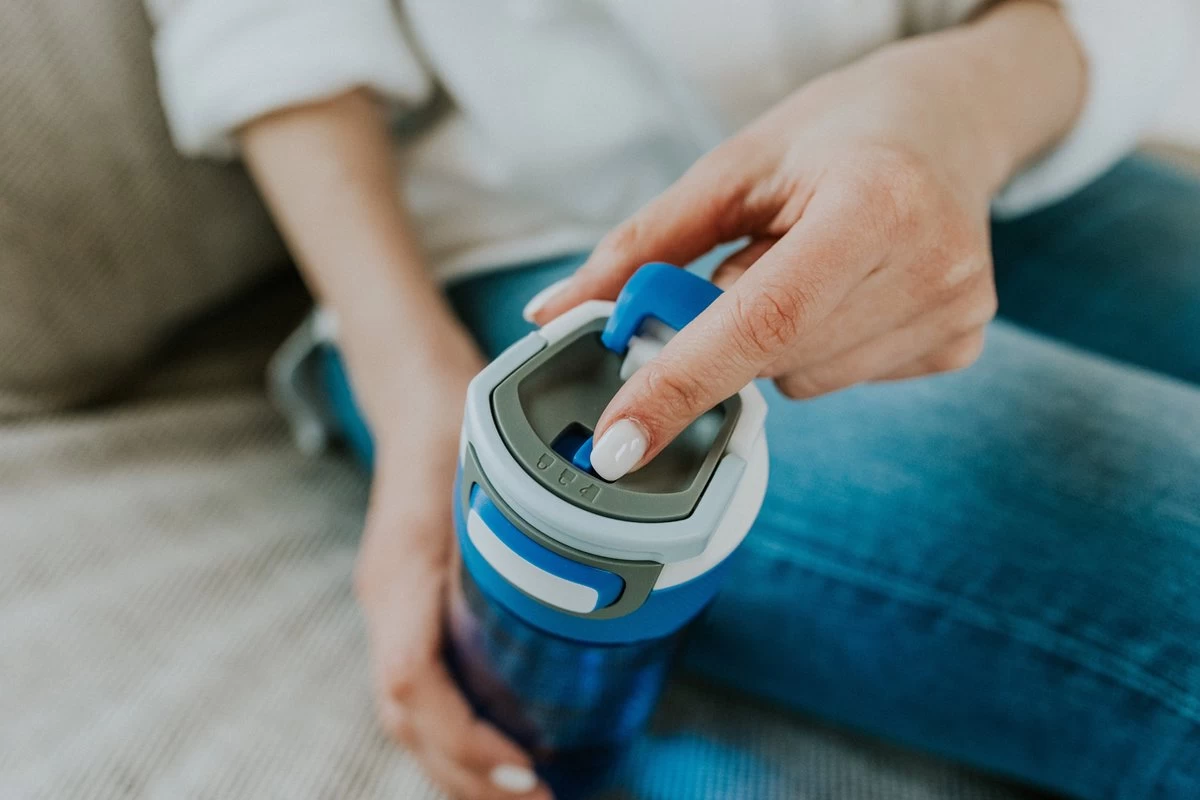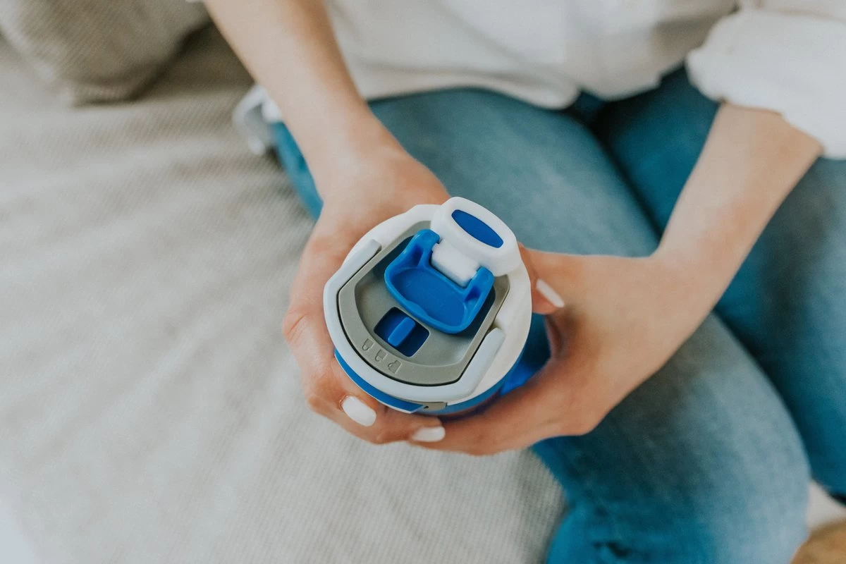 1: Druk’-positie: druk op de knop van onze drinkfles om een slok te nemen. Nooit meer morsen terwijl je haast naar de volgende meeting of al rennend je trein probeert te halen.