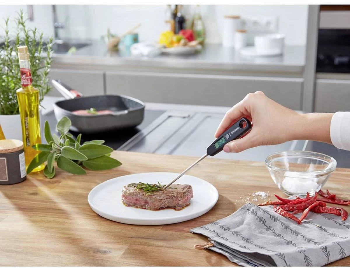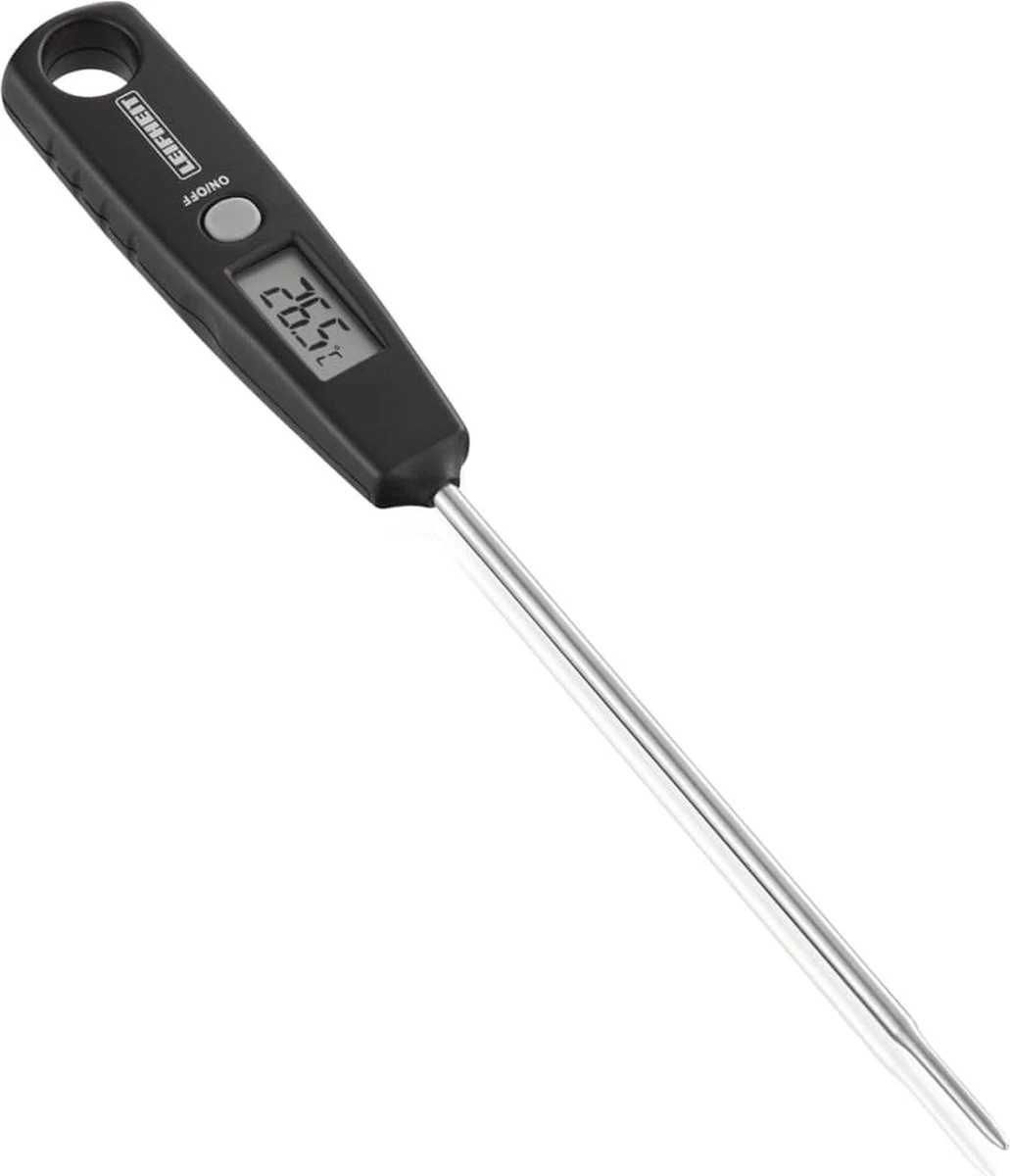 Met de universele digitale keukenthermometer van Leifheit weet je het binnen enkele seconden: heeft de babymelk de juiste drinktemperatuur? Is de kerntemperatuur van het vlees optimaal? Deze handige thermometer laat heel snel de temperatuur zien. Dompel de lange, roestvrijstalen meetvoeler in wijn, theewater, melk of pap – of prik hem in de cake of in het vlees – en de temperatuur verschijnt direct op het display. Het meetbereik ligt tussen -45 °C en +200 °C, met exacte stappen van 0,1 °C.