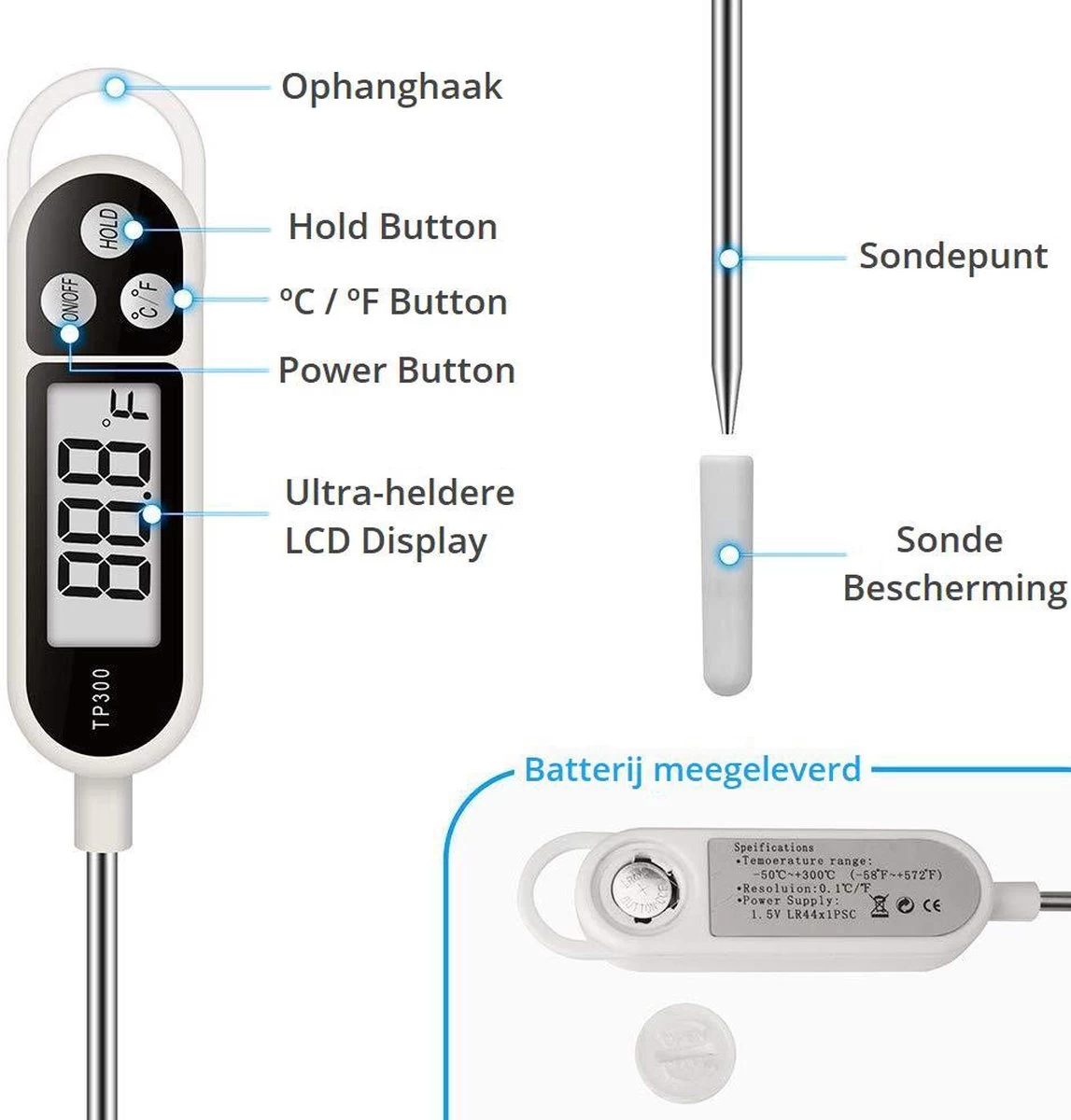 Deze veelzijdige digitale thermometer voor zowel binnen (keuken) als buiten is een ideale thermometer om de kerntemperatuur van vlees, vis, melk, water, thee te meten tijdens het bakken, koken of BBQ’en. Je kunt deze thermometer ook gebruiken om de temperatuur van andere vloeistoffen te meten.
