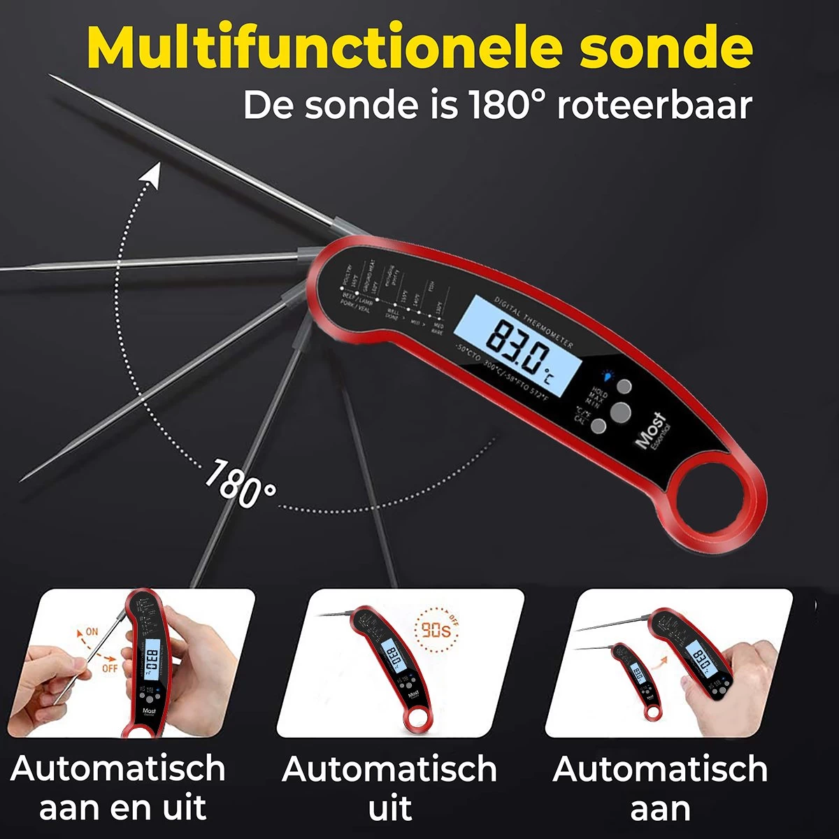 Wanneer je de sonde uitklapt gaat de thermometer automatisch aan. De hoge resolutie sonde zorgt ervoor dat de temperatuur automatisch binnen 1 seconde wordt weergeven zodat jij direct de temperatuur weet. Vervolgens klap je de sonde na het meten weer dicht en gaat de thermometer vanzelf uit.