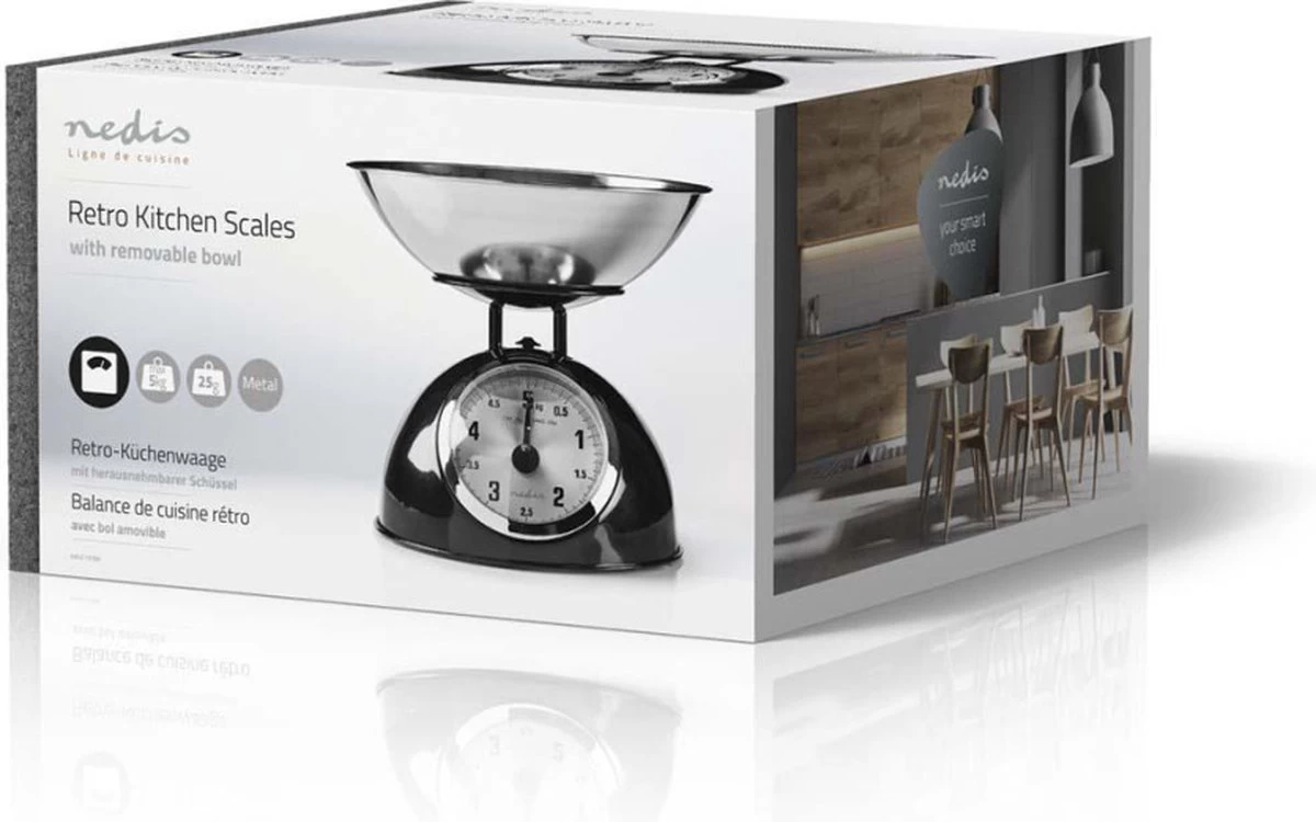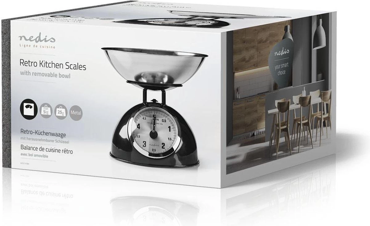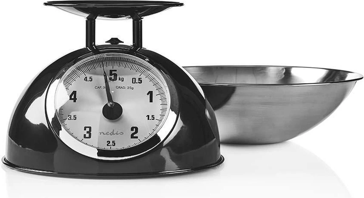 Analoge retro keukenweegschaal om ingrediënten tot maximaal 5 kilogram af te wegen. Wordt geleverd met een eenvoudig te reinigen, afneembare roestvrijstalen kom.