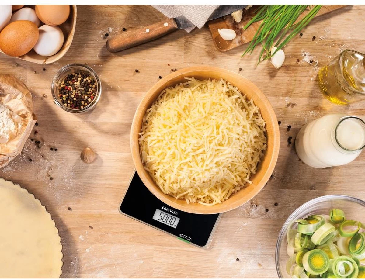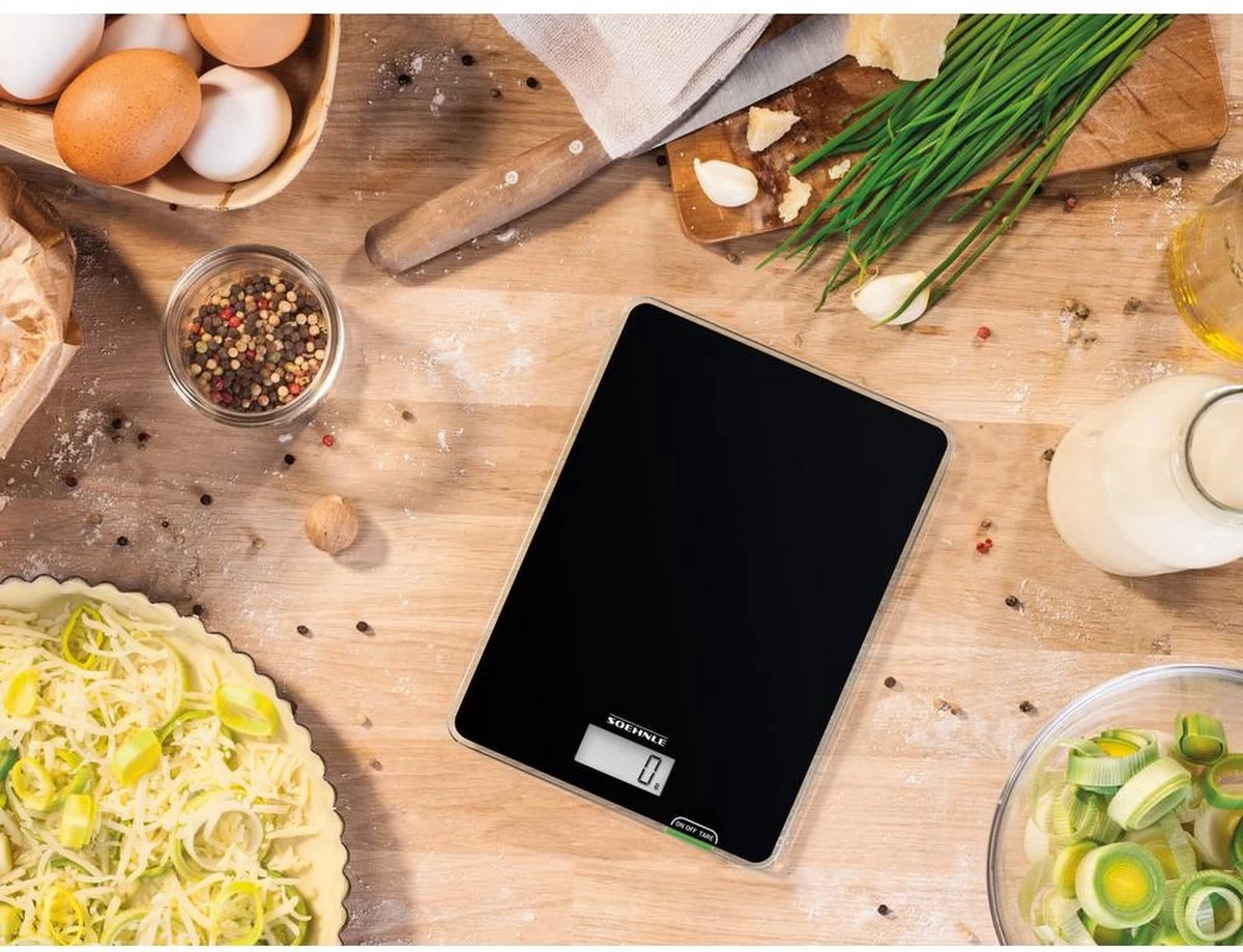 Met zijn aantrekkelijk, tijdloos moderne design en gemakkelijke bediening past de Soehnle keukenweegschaal Page Compact 100 perfect in de starterskeuken. Deze weegschaal is klein en compact, maar presteert daarom zeker niet minder. Hij weegt maximaal 5 kg en tot op 1 gram nauwkeurig. Met goed leesbaar lcd-display en praktische bijweegfunctie (tarra) – belangrijke functies bij het dagelijks gebruik. De Page Compact 100 is een bijzonder platte compacte weegschaal die zeer plaatsbesparend opgeborgen kan worden. De weegschaal gaat automatisch uit. Dat bespaart veel energie. De meegeleverde batterijen gaan zelfs bij tweemaal daags gebruik wel twee jaar mee. De batterijen zitten veilig in de batterijbehuizing dat stevig vastgeschroefd kan worden. Zo blijven ze buiten bereik van kinderhandjes.