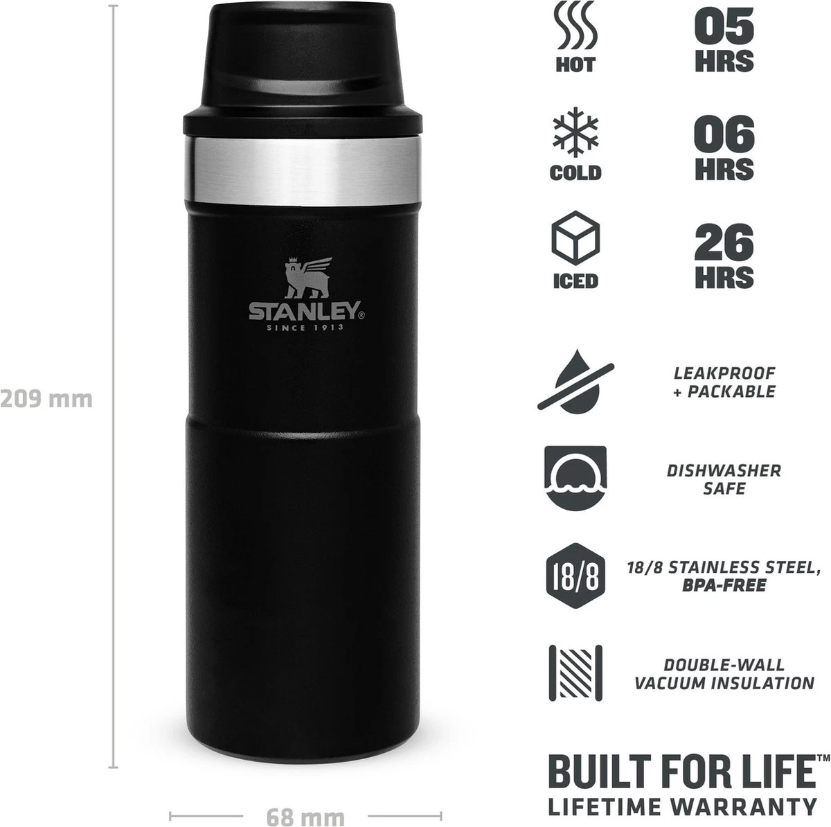 Stanley Trigger Action Travel Mug 0.35L / 12OZ Matt Black– Lekvrij | Vacuüm geïsoleerde thee en koffie reismok | BPA-vrij | Roestvrijstalen thermosbeker | Vaatwasserbestendig