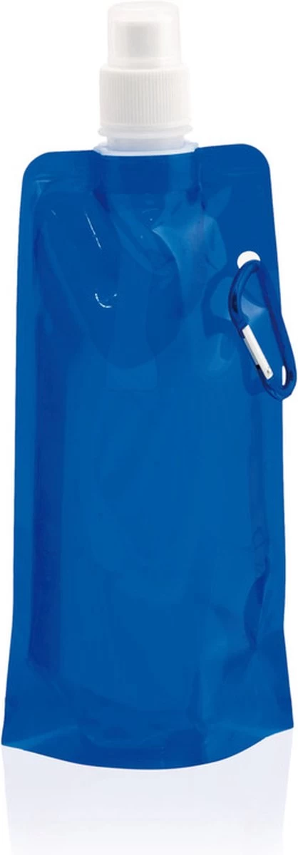 Waterzak blauw 400 ml opvouwbaar met haak. Handige waterfles van opvouwbaar en oprolbaar plastic. Met een haakje zodat u deze overal aan kunt hangen. De waterfles wordt geleverd met een drinkmondje erop en is hervulbaar. Inhoud: Ongeveer 400ml. Materiaal: Kunststof. Kleur: Blauw. Outdoor festival gadget benodigdheden.