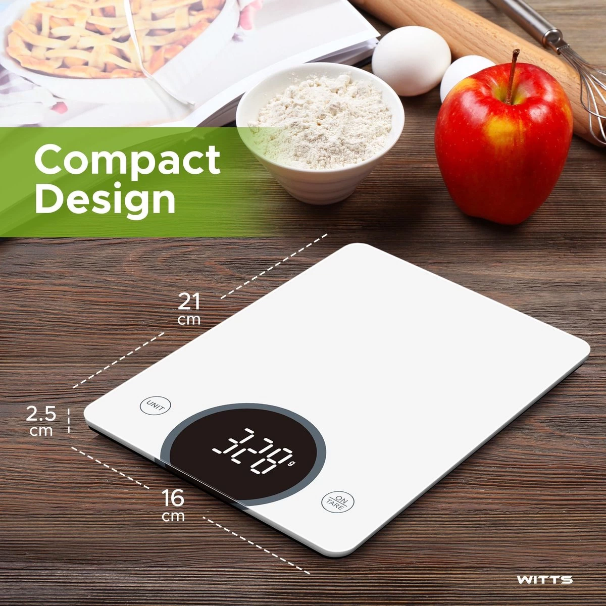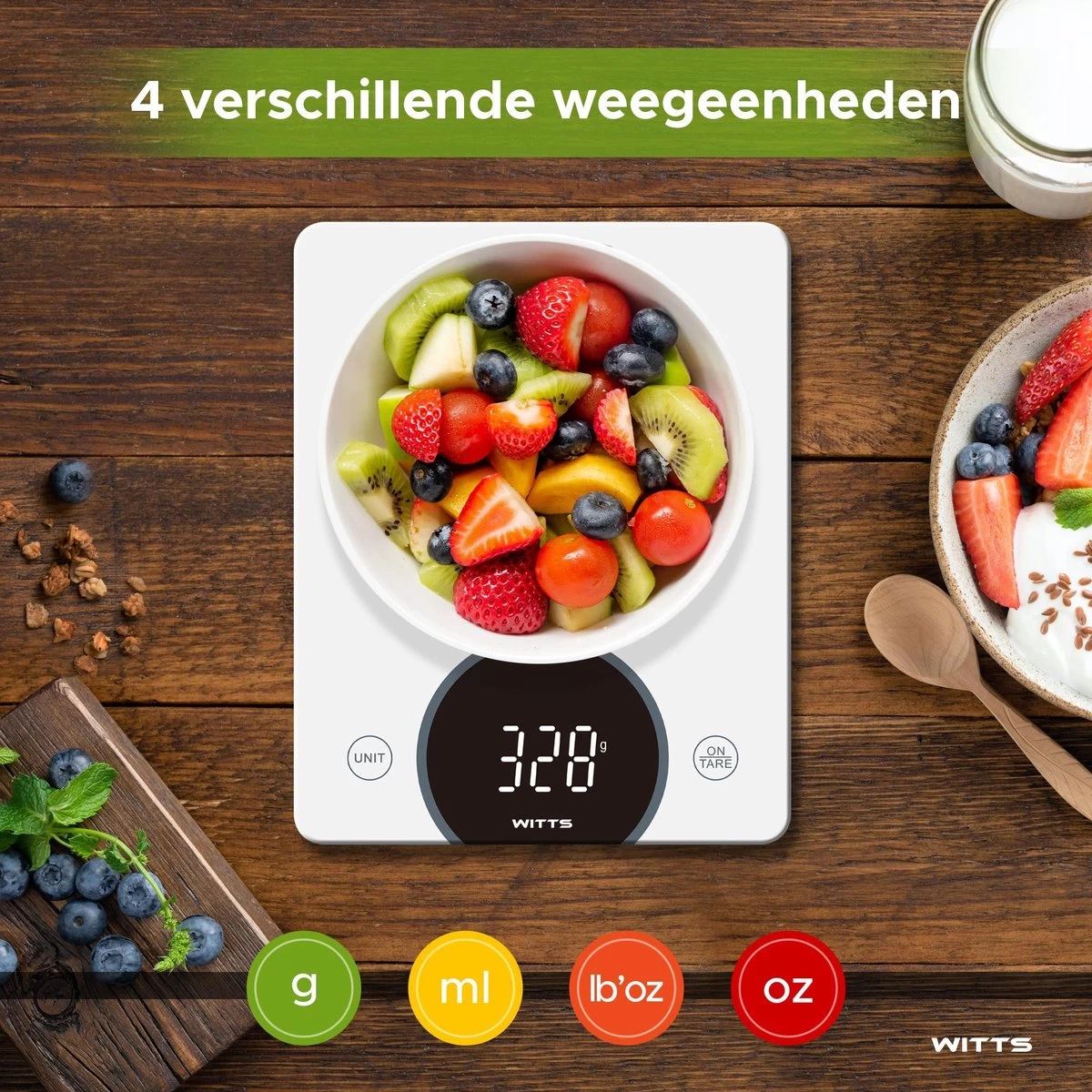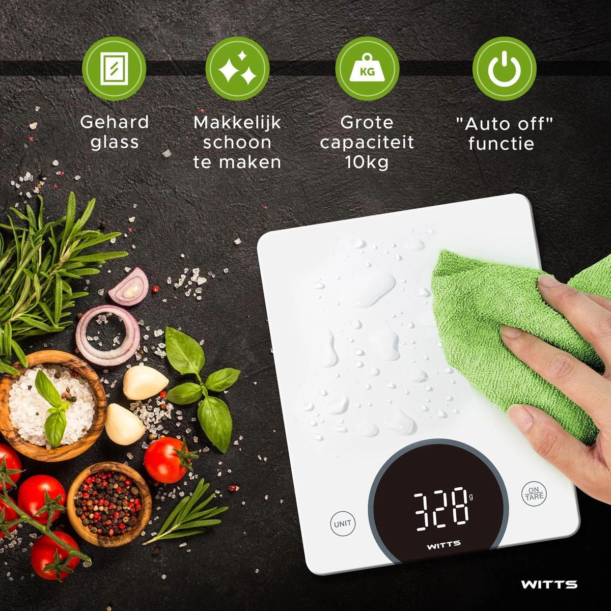 Maar de Witts digitale weegschaal heeft meer handigheidjes. Zo heeft de Witts digitale weegschaal een tarra-functie. Daarmee stel je het nulpunt in, inclusief het bakje of schaaltje dat je op de weegschaal hebt gezet. De weegschaal weegt dan dus alleen dat wat je aan ingrediënten in het schaaltje of bakje doet. Ideaal! Ook ideaal: de Witts digitale keukenweegschaal heeft geen oppervlakte met ribbeltjes of randjes waar viezigheid tussen kan komen. Even een vochtig doekje over de glasplaat en je digitale weegschaal is weer schoon! En ook niet onbelangrijk: met zijn ingetogen vormgeving is de weegschaal een elegante aanwinst voor het aanrecht!