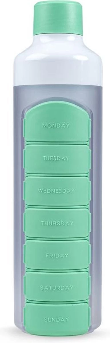 Hij is lekvrij en robuust uitgevoerd. Het pillencompartiment met 7 vakjes is eenvoudig met het schuifsysteem met magneet van de fles af te schuiven en er weer op.